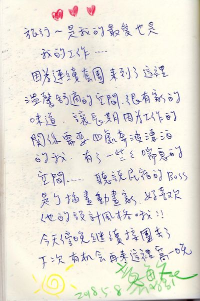 溫馨舒適的空間很有家的味道,讓長期因為工作的關係需要四處奔波漂泊的我,有了一些喘息的空間….聽說民宿的BOSS是個插畫動畫家,好喜歡他的設計風格哦!! 今天傍晚繼續接團去了,下次有機會再來窩一晚~